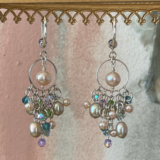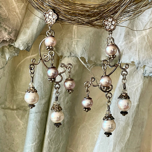 Rain Goddess / Antiqued Sterling Silver Chandelier Earrings with Freshwater & Saltwater Pearls